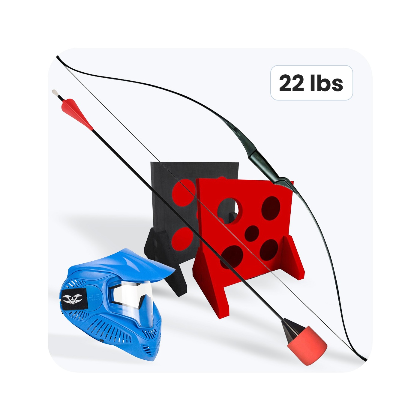 Les arcs de 22 lbs conviennent aux débutants comme aux joueurs plus expérimentés, offrant précision et fluidité. Les flèches à embout en mousse, légères et sûres, permettent des parties rapides et contrôlées.