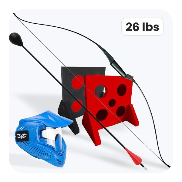 Les arcs de 26 lbs garantissent des émotions intenses et une plus grande précision, appréciées par les joueurs avancés. Les flèches rapides, légères et aérodynamiques, réduisent le risque de blessure et assurent un jeu sûr même avec une forte rotation des participants.