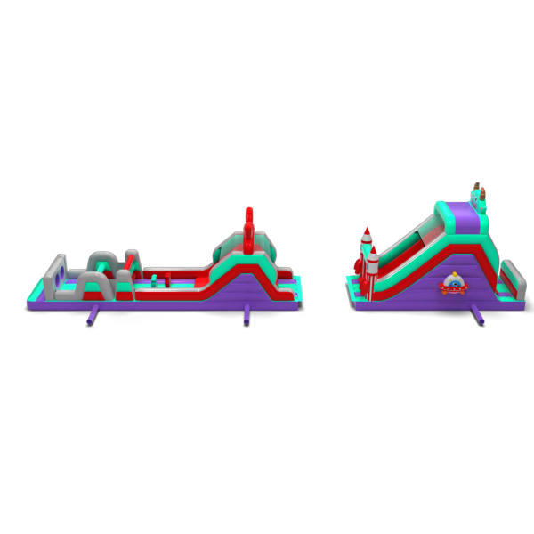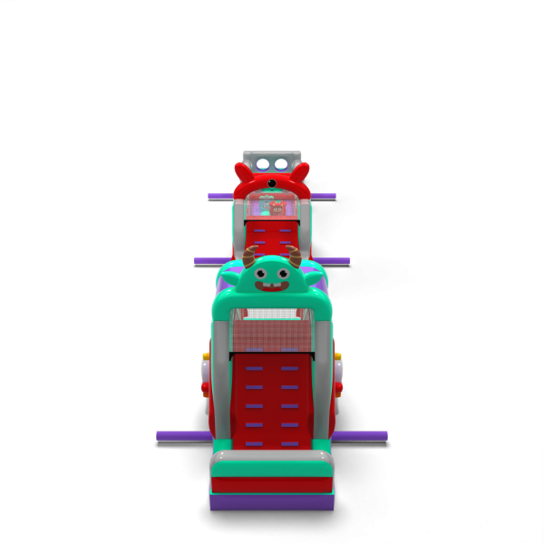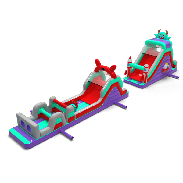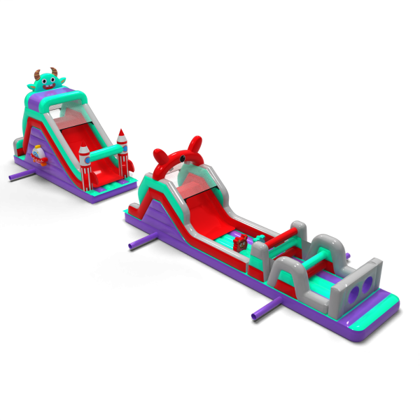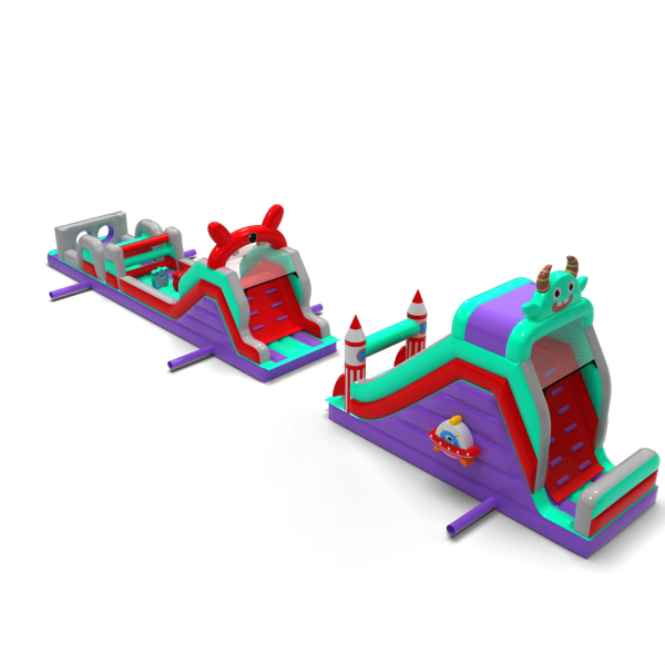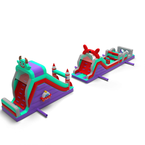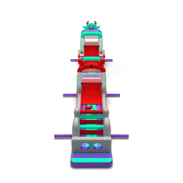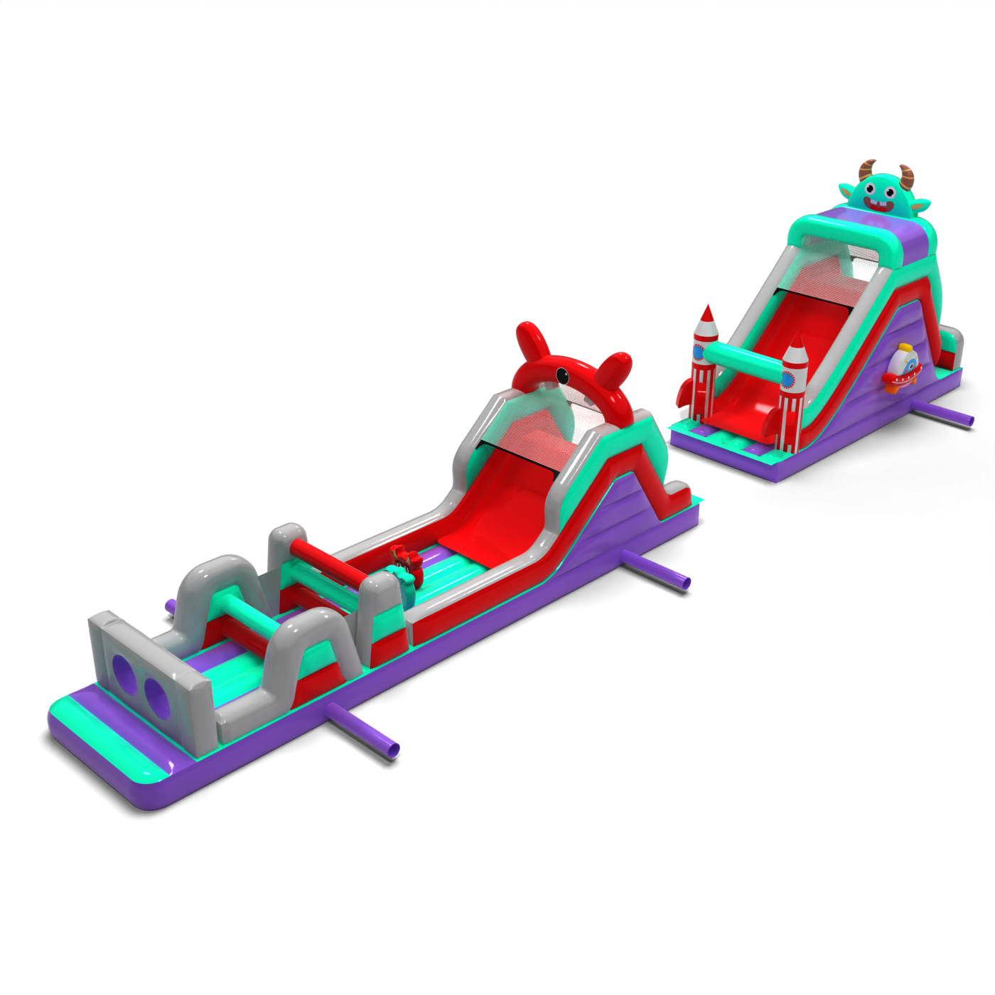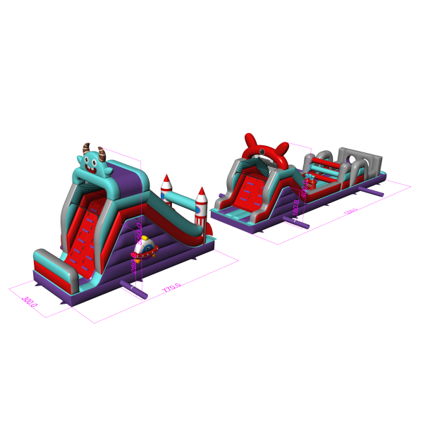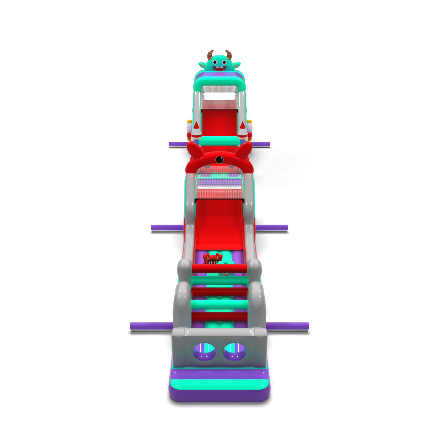 Le parcours d'obstacles de 20 mètres de long est une attraction bien équilibrée qui peut être utilisée lors d'une variété d'événements. Elle se compose de trois segments principaux, dont une double section de toboggan et une section de franchissement d'obstacles. Grâce à sa longueur, elle offre un parcours de franchissement plus long, ce qui permet aux enfants de jouer plus longtemps sans avoir à tourner fréquemment. Le thème graphique est maintenu dans une esthétique cohérente et conviviale.
