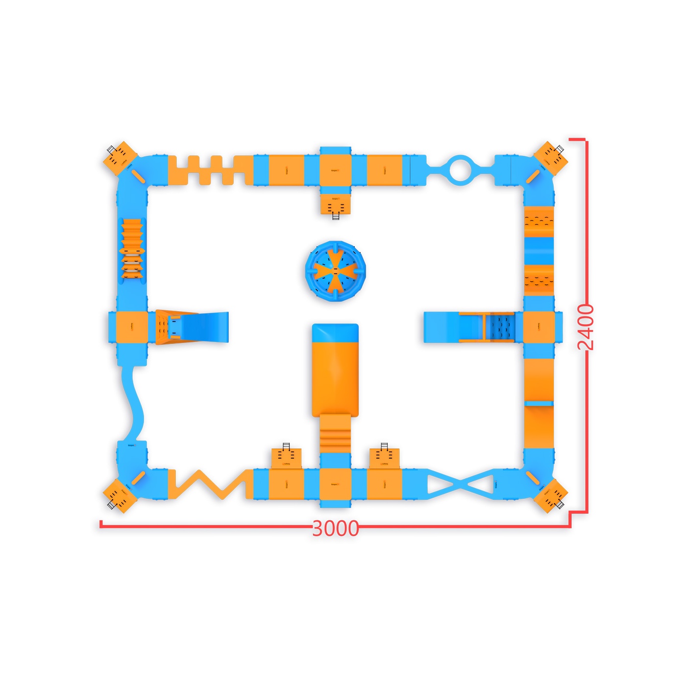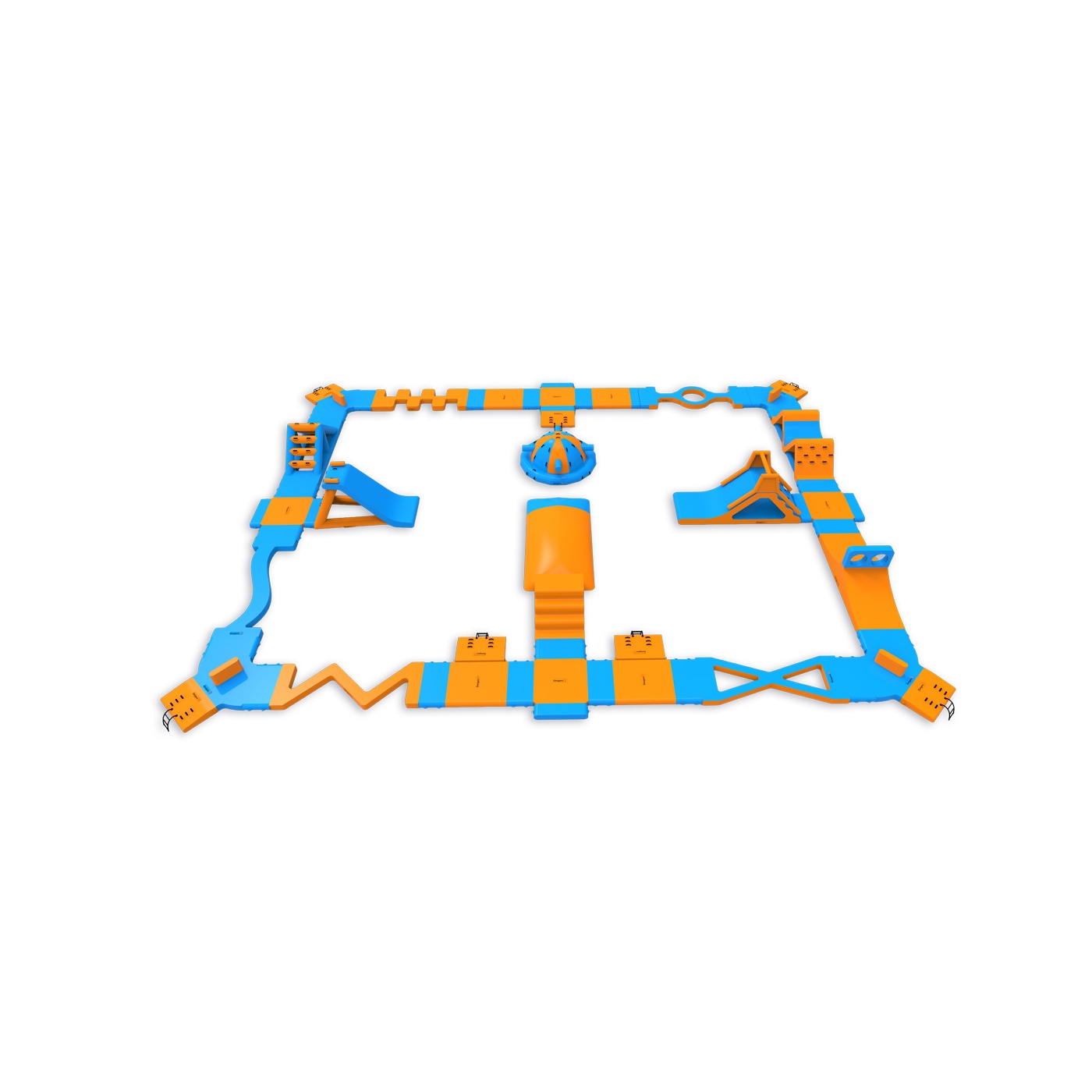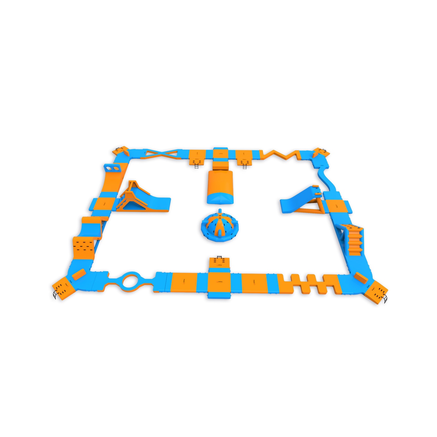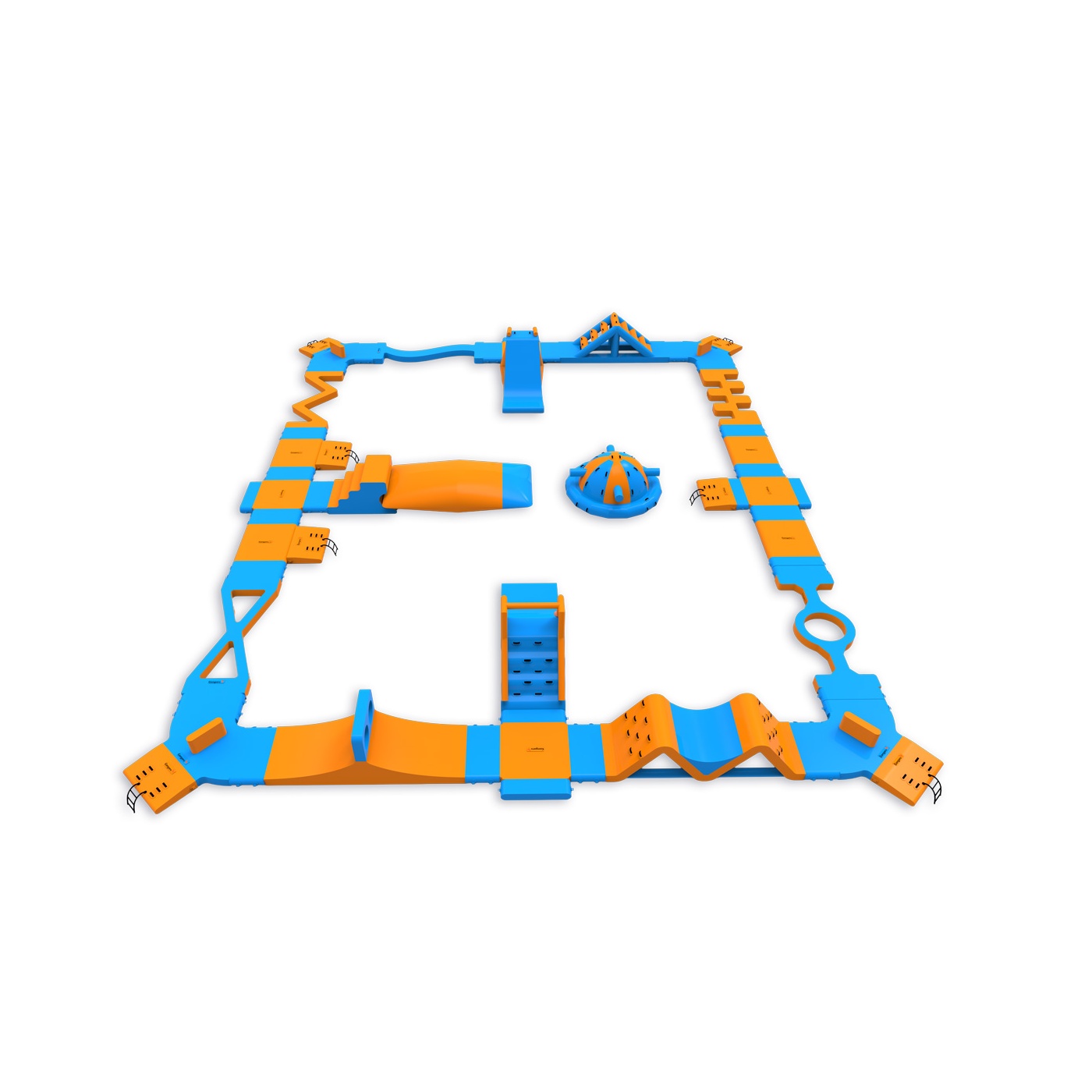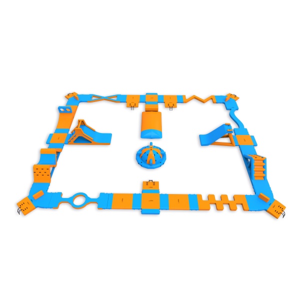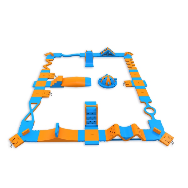 Un coussin de saut au centre du parc - un élément qui attire les participants et prolonge naturellement leur temps sur l'eau. Un parcours d'obstacles avec deux toboggans, une balle et des éléments d'escalade offre de l'activité à tous les participants, qu'ils attendent de sauter ou qu'ils viennent de terminer un tour. Conçu pour 76 personnes à la fois, il convient parfaitement aux plans d'eau de taille moyenne où la variété et le taux de rotation élevé des visiteurs sont importants.