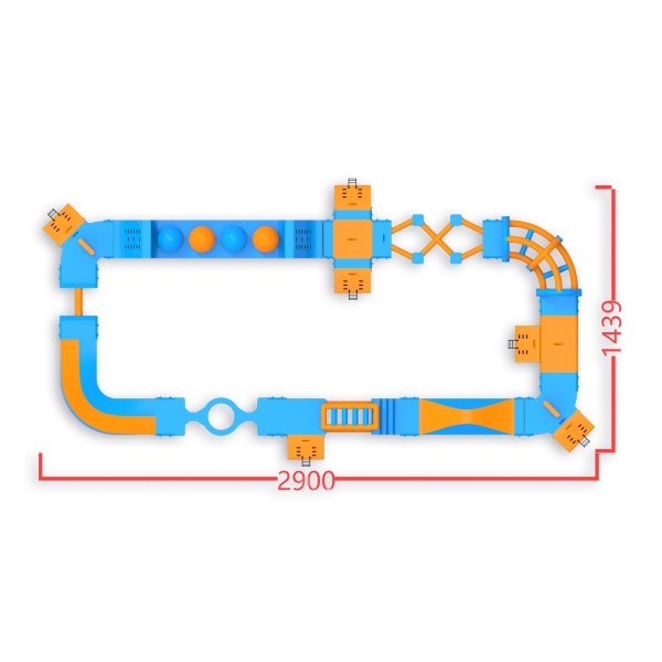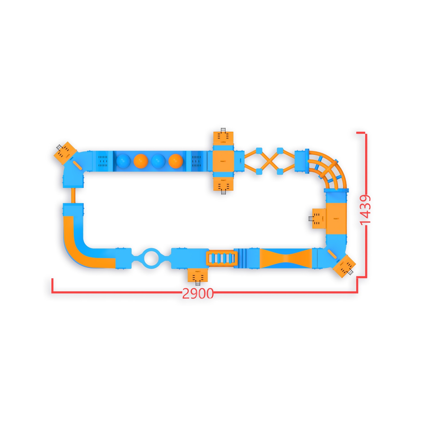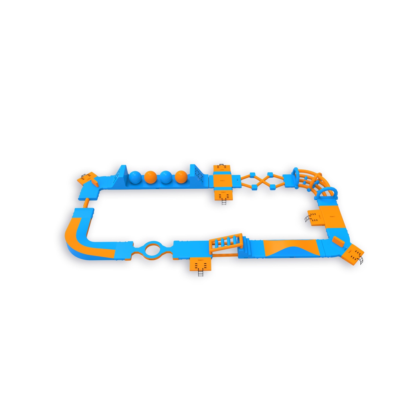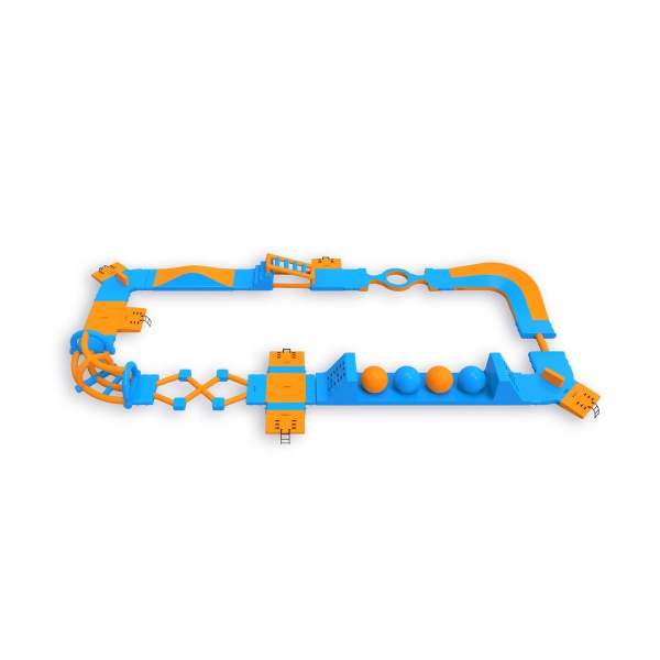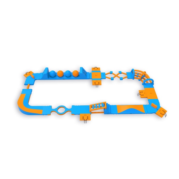 Quatre balles Wipeout avec des plates-formes de saut - un élément qui maintient les participants engagés plus longtemps et encourage d'autres approches. Un périmètre de 406 m² avec des haies, des escaliers et des éléments d'équilibre mène à travers des zones d'activité successives, offrant un flux de groupe naturel pouvant accueillir jusqu'à 40 personnes à la fois. Ce système fonctionne bien sur les plans d'eau de taille moyenne, où il est important d'avoir des attractions disponibles pour un large éventail d'invités et un taux de rotation élevé tout au long de la journée.