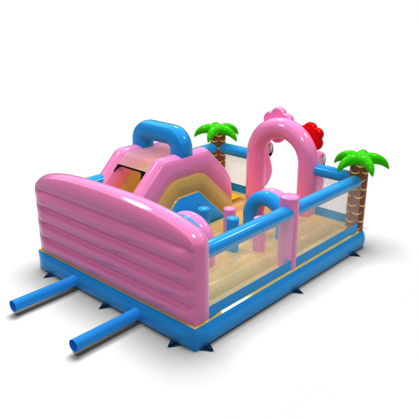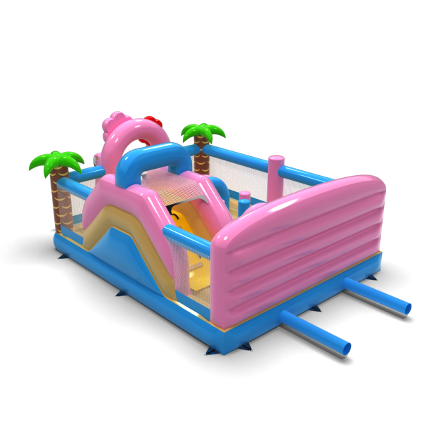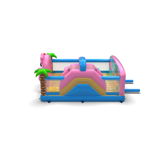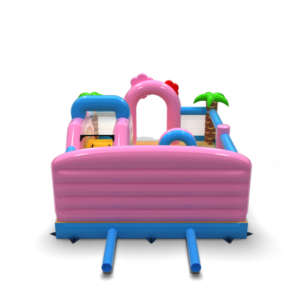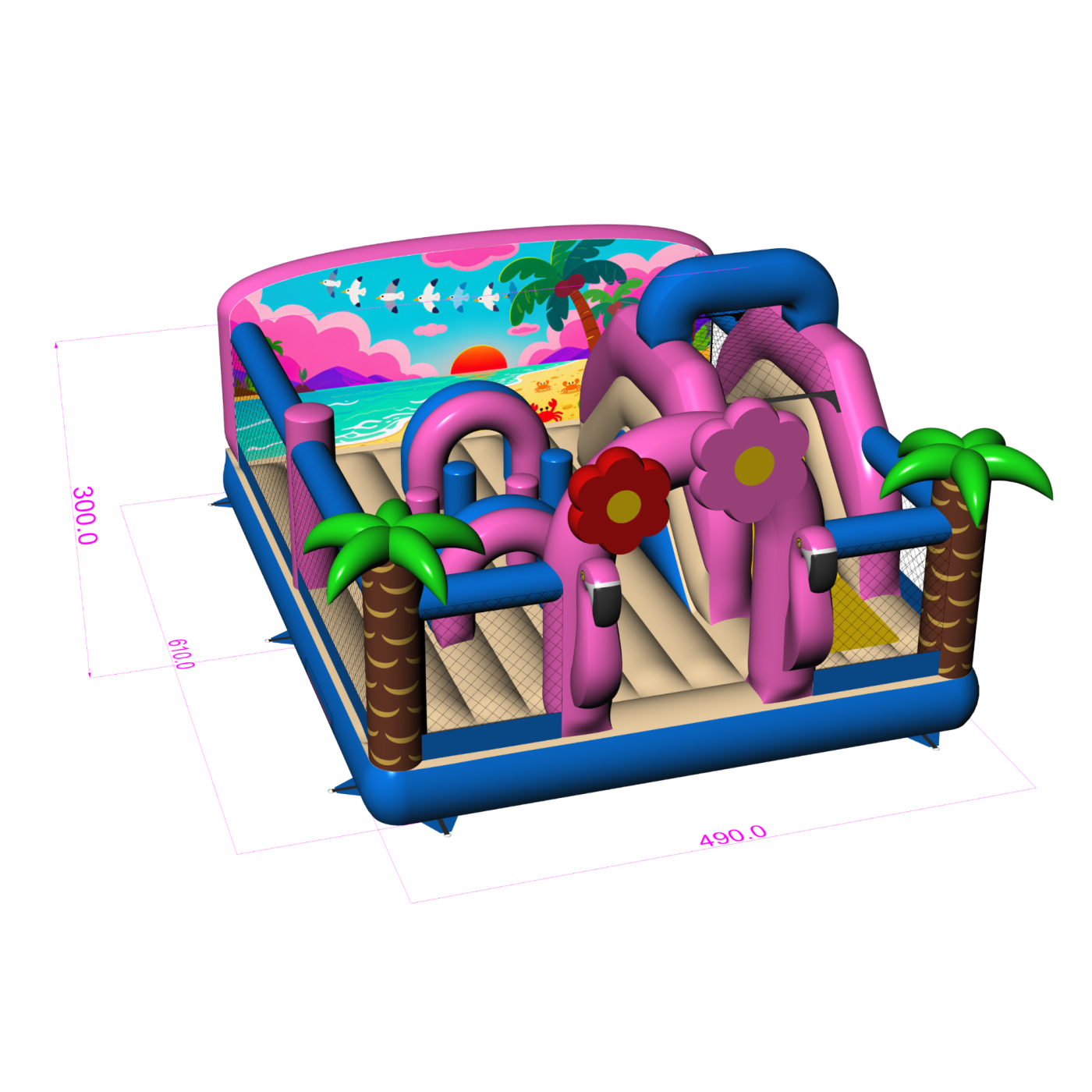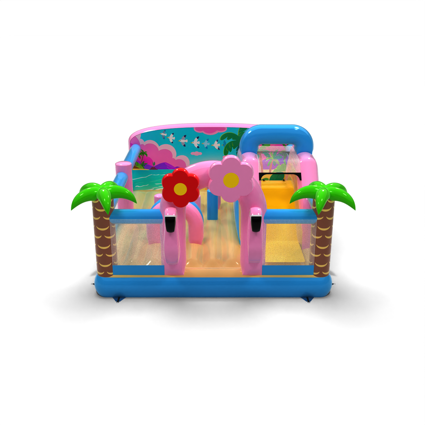L'aire de jeux gonflable 6x5 sur le thème d'Hawaï est destinée aux sociétés de location et aux organisateurs d'événements qui souhaitent attirer l'attention avec une attraction colorée et exotique. Les flamants roses, les palmiers et les paysages de vacances créent une atmosphère d'aventure tropicale qui distingue la zone pour enfants et encourage le jeu. Le design combine des éléments de jeu classiques - tunnel, toboggan et obstacles - avec un espace sûr et aéré. Grâce à sa taille compacte et à sa grande surface de jeu, l'attraction est idéale pour les zones à forte rotation de participants. Enrichissez votre offre avec un thème qui stimule l'imagination et attire les petits comme un aimant.