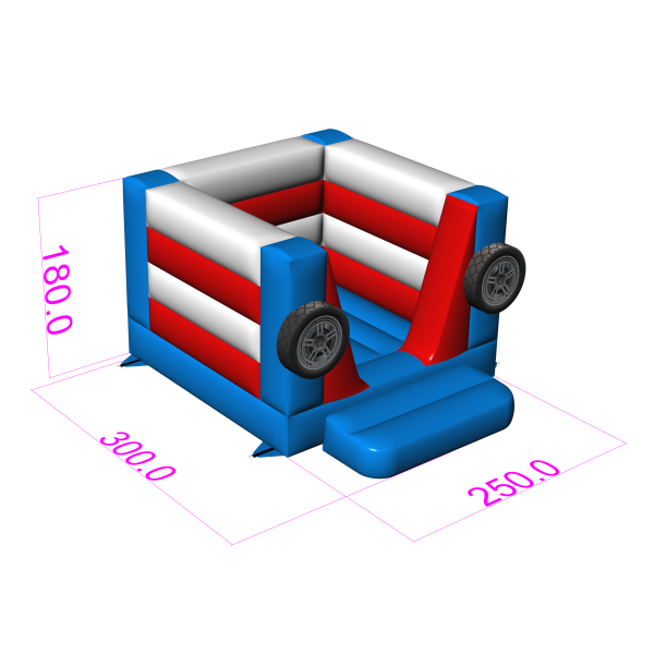 Comme toutes nos attractions gonflables, le produit est fabriqué à partir de matériaux de haute qualité, en l'occurrence un PVC de nouvelle génération très résistant à la déchirure. Petit château gonflable - sur le thème de la voiture a 3 m x 2,5 m x 1,8 m (longueur, largeur et hauteur). Conforme à la norme de sécurité EN 14960 pour les équipements de jeux gonflables. Nous recommandons l'utilisation de structures gonflables pour la structure gonflable, que nous ajoutons à l'ensemble. Comme la plupart de nos attractions, la structure gonflable est garantie deux ans. Chez Gangaru, nous veillons à ce que vous ayez le moins de travail possible. Nous fournissons un ensemble complet d'accessoires nécessaires à la fixation de l'attraction (cordes, piquets) dans l'emballage de la structure gonflable. La sécurité de la structure gonflable a été vérifiée par un évaluateur indépendant.