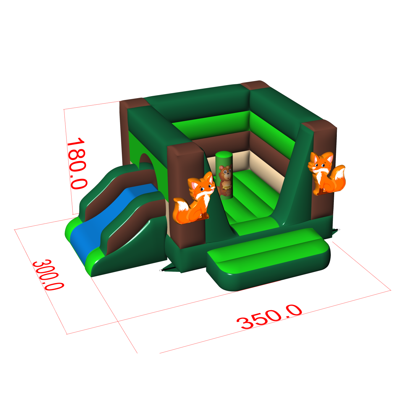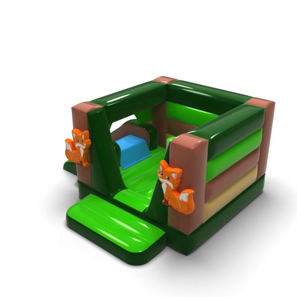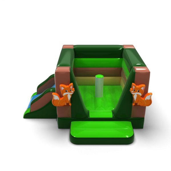 Cette version du château gonflable a été enrichie d'un petit toboggan qui prolonge le temps et l'attrait du jeu. La couleur vert-brun rappelle la forêt, et le motif du renard donne à la structure un air amical. Grâce à ses dimensions compactes, l'unité convient aussi bien à l'extérieur qu'aux petites pièces. Il s'agit d'un point focal moderne que vous pouvez facilement adapter à différents scénarios d'événements.