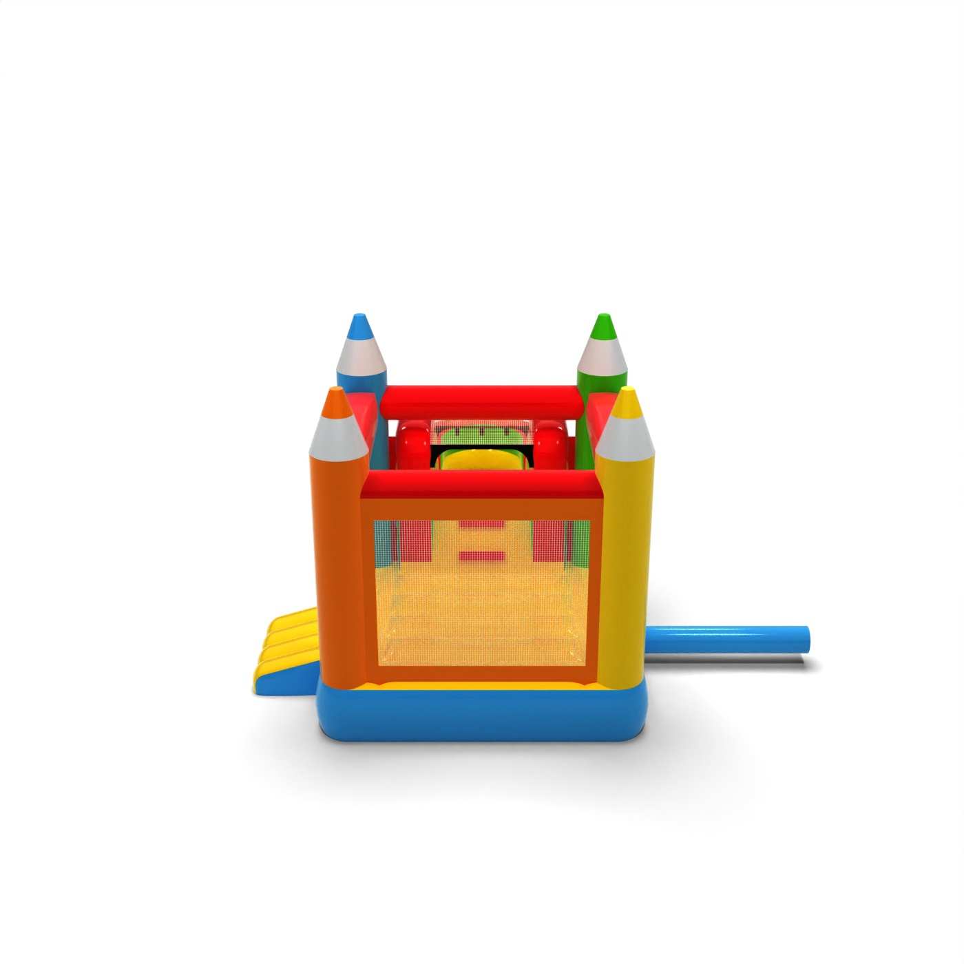 La combinaison des jeux d'eau et du style tableau noir crée une attraction estivale légère au caractère créatif distinct. La zone de sauts et de toboggans permet aux enfants de bouger et de se rafraîchir pendant les journées chaudes. Les couleurs pastel et les formes distinctives des crayons donnent à l'ensemble un air de vacances sympathique. Il s'agit d'une proposition intéressante pour les sociétés de location qui élargissent leur offre avec des attractions aquatiques saisonnières. Le modèle sera utile pour les pique-niques d'été, les festivals et les événements familiaux en plein air.