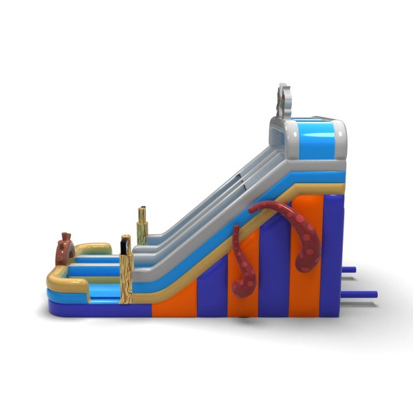 Le double toboggan de style pirate est destiné aux petits aventuriers. Les décorations en forme de drapeaux, de gouvernails et de pieuvre donnent à l'attraction un air nautique, ce qui est parfait pour les événements à thème en plein air. Deux pistes de toboggan indépendantes augmentent la capacité et réduisent les temps d'attente. Ce modèle est parfait pour les entreprises qui organisent des festivals, des événements urbains et des événements familiaux en plein air.
