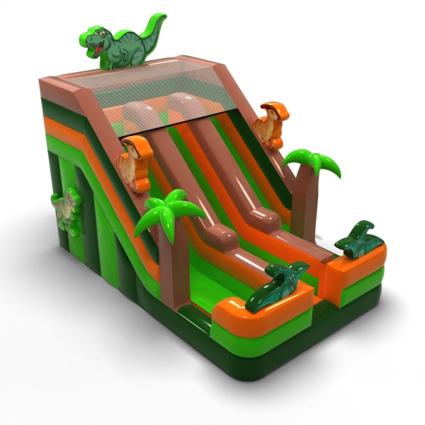 Le toboggan compact au design de dinosaure combine un effet visuel distinct avec une forme adaptée aux espaces événementiels plus petits. Deux pistes de toboggan parallèles permettent aux enfants de jouer simultanément, ce qui augmente la fluidité du jeu et réduit les temps d'attente. L'atmosphère jurassique crée un sentiment d'aventure et permet à l'attraction de capter rapidement l'attention des plus jeunes participants. Le format réduit fait de ce modèle un choix pratique pour les sociétés de location qui proposent des productions plus courtes et des événements plus intimes. L'attraction est idéale pour les festivals locaux, les pique-niques familiaux et les animations en plein air, où la mobilité, le dynamisme et un thème reconnaissable sont importants.