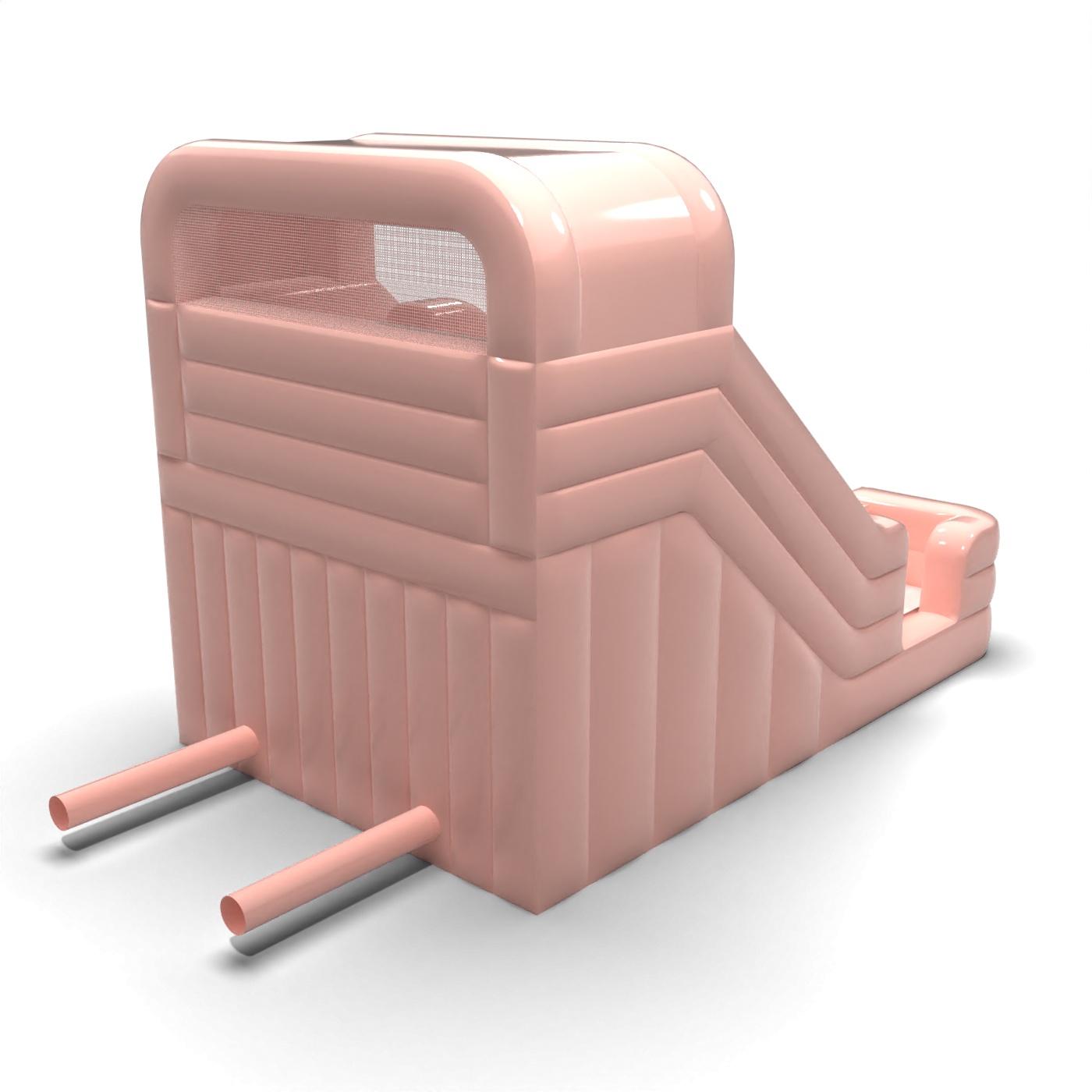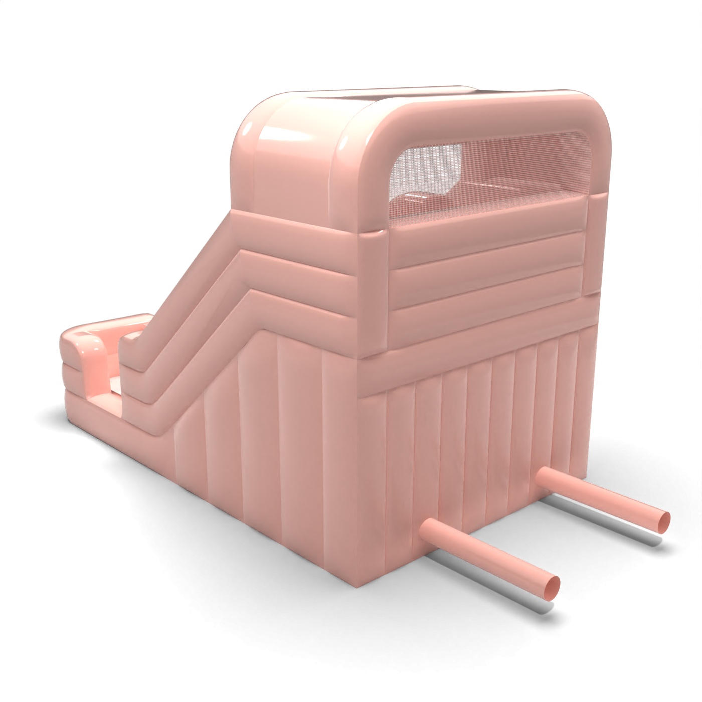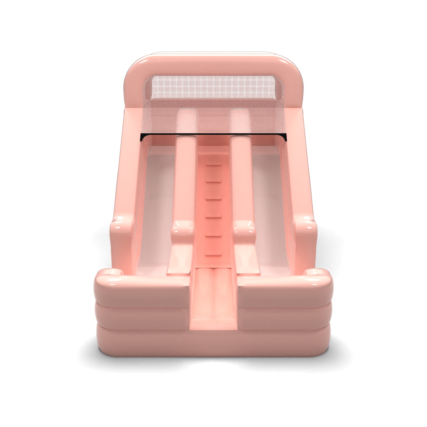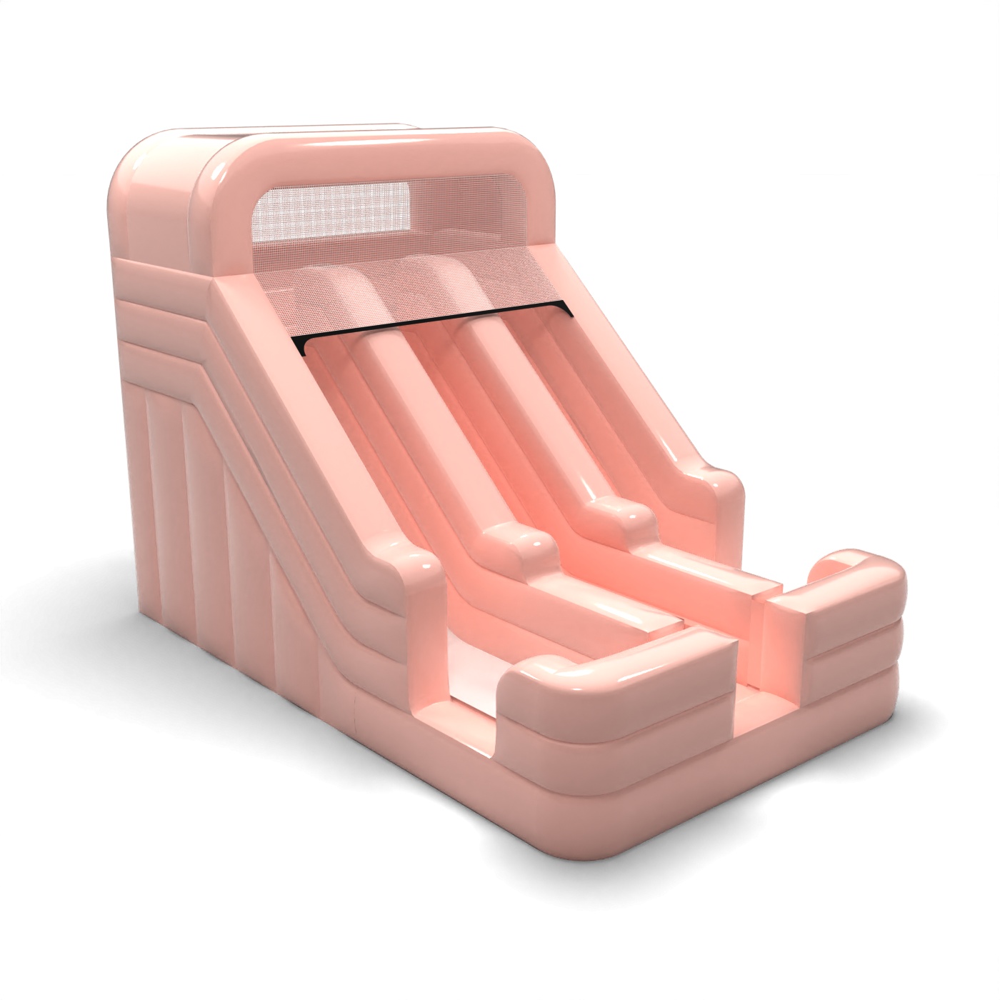 Le design à deux pistes en rose pastel crée une attraction accrocheuse mais esthétiquement discrète, idéale pour les familles. Les pistes de toboggan parallèles permettent aux enfants d'utiliser la structure gonflable en même temps, ce qui augmente la fluidité du jeu et réduit les temps d'attente. Le corps compact et clairement défini fait bonne figure dans la zone réservée aux enfants sans dominer l'ensemble de l'espace de l'événement. C'est un modèle qui convient aux locations pour les fêtes d'anniversaire en plein air, les réceptions de communion et les pique-niques élégants. Le toboggan est idéal lorsque l'esthétique, une bonne rotation des participants et un accent visuel clair mais subtil sont importants.